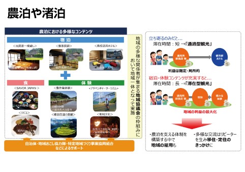 この取組みは農村や漁村に宿泊してその地域の食や文化、仕事を体験して楽しむ滞在型旅行になりますし、インバウンドを含めた観光客に移住や定住を促す効果も期待されます。